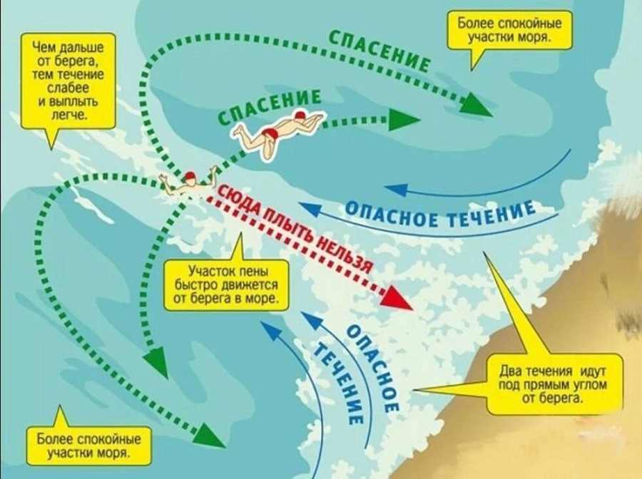 2) если вы гребёте по правилам — в сторону, а выбраться не удаётся, значит рип (зона отбойного течения) широкий, нужно прекратить тратить силы и паниковать (обратное течение обычно недолгое и уже через 3-4 минуты прекращается, после этого следует отплыть на 50-100 метров в сторону, а потом возвращаться на берег),