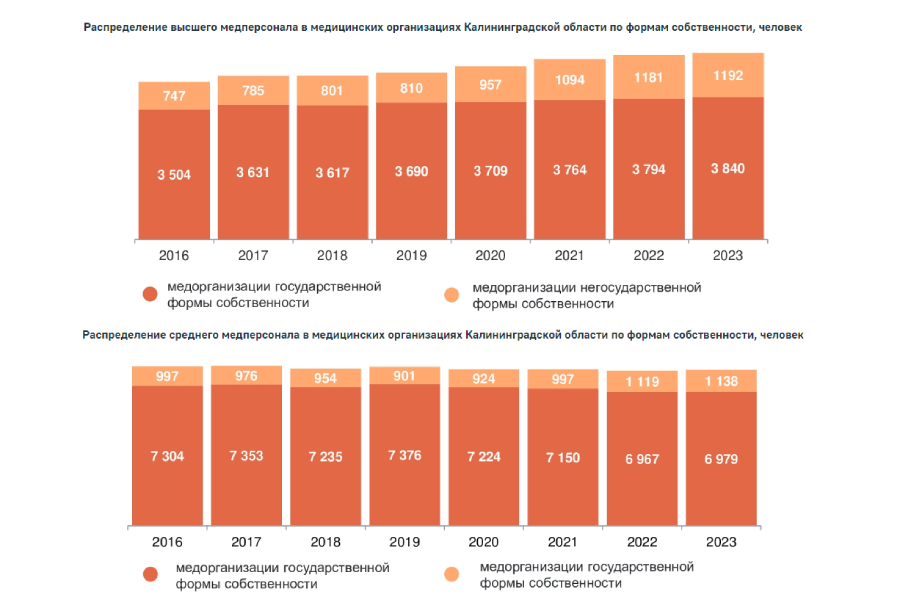 Отмечается, что за последние семь лет (с 2016 по 2023 годы) количество врачей росло как в частных, так и в государственных клиниках. При этом численность медперсонала в коммерческих организациях росла быстрее, чем в государственных. Так, в медорганизациях негосударственной формы собственности количество врачей выросло с 747 до 1192. В государственных больницах — с 3504 до 3840.