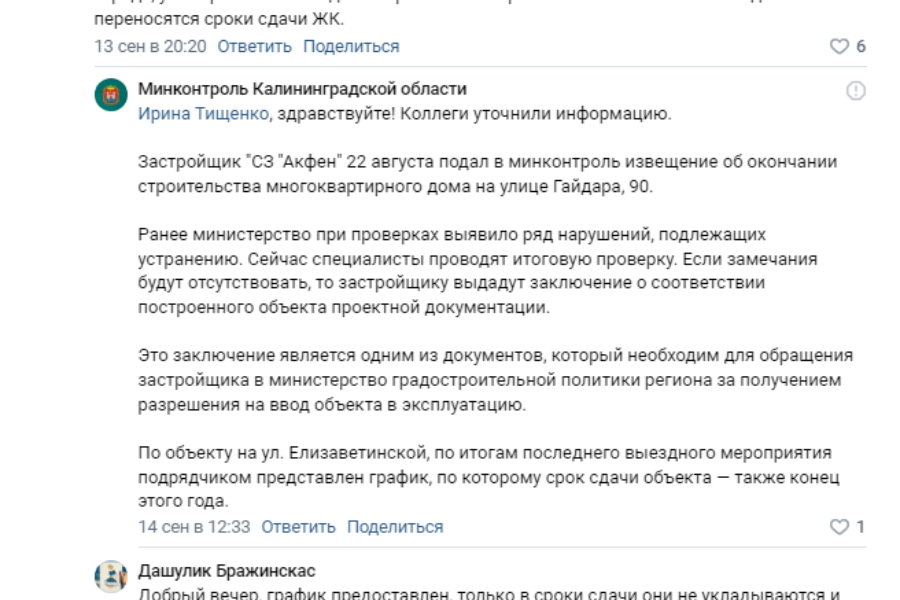 «Застройщик «СЗ „Акфен“ 22 августа подал в минконтроль извещение об окончании строительства многоквартирного дома на улице Гайдара, 90. Ранее министерство при проверках выявило ряд нарушений, подлежащих устранению. Сейчас специалисты проводят итоговую проверку. Если замечания будут отсутствовать, то застройщику выдадут заключение о соответствии построенного объекта проектной документации», — написало ведомство.