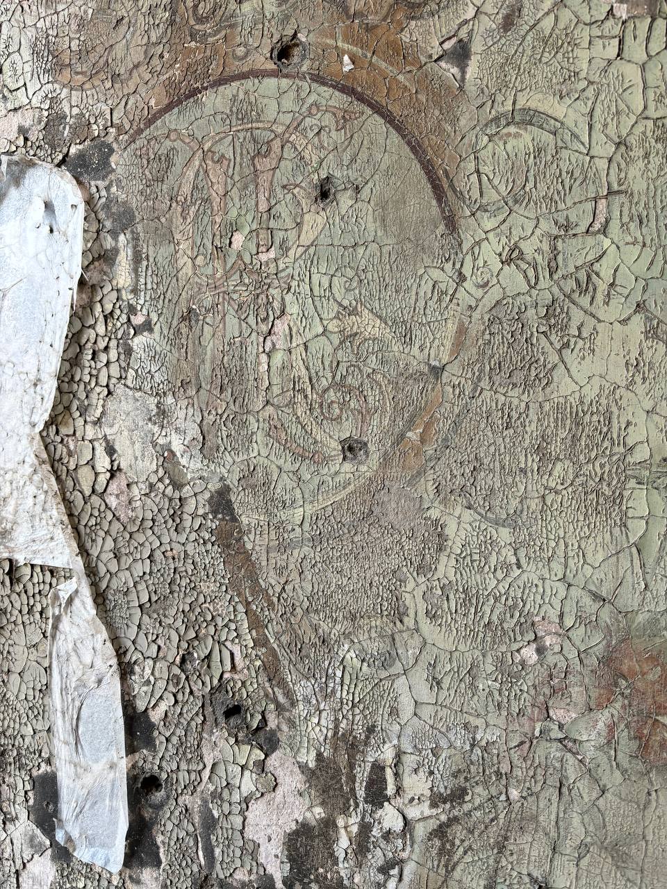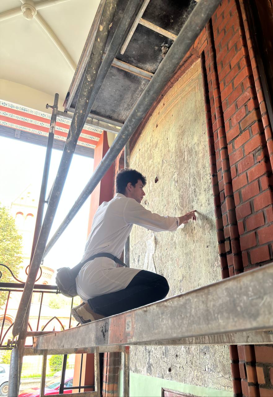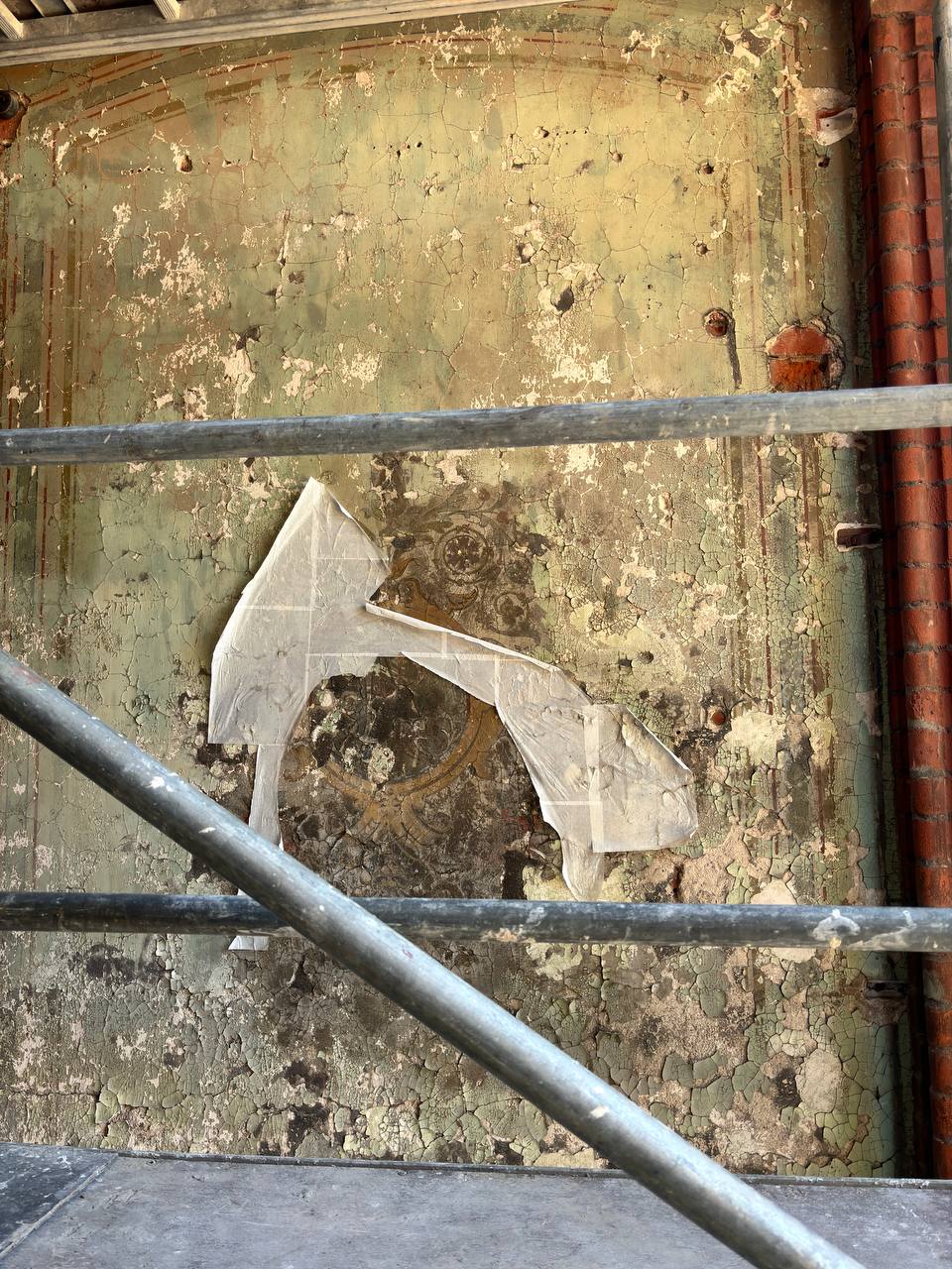 «Живопись, созданная не позднее первого десятилетия XX века, была обнаружена в ходе капитального ремонта фасада. Чтобы не навредить наследию была произведена профилактическая оклейка, которая предотвращала механические повреждения росписи и сохранила её до приезда реставраторов», — рассказали в ФКР. Фреска была обнаружена в сентябре 2023 года.