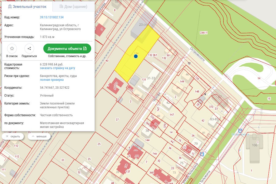 Указанный земельный участок площадью 1 873 кв.м, по данным публичной кадастровой карты, предназначен для малоэтажной многоквартирной жилой застройки. Его кадастровая стоимость — порядка 6,2 млн рублей.