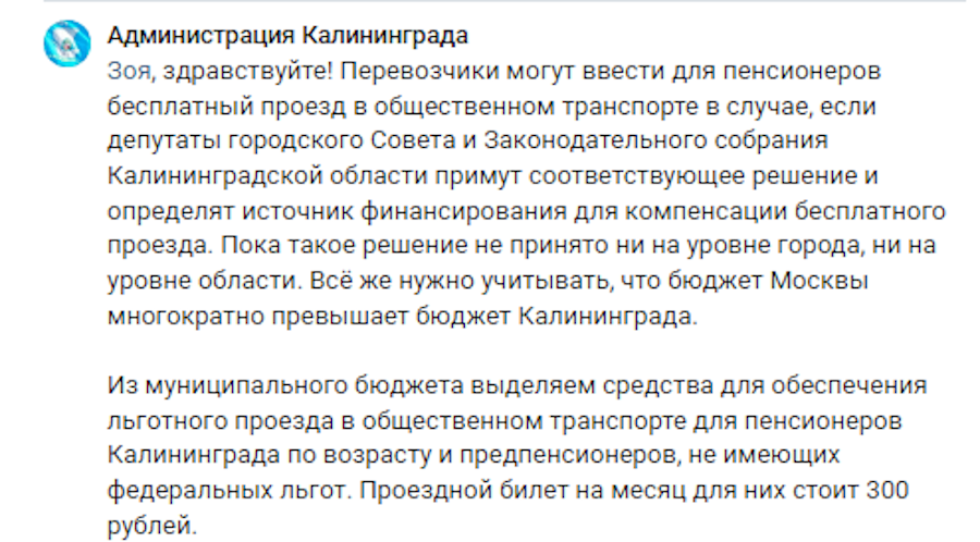 «Перевозчики могут ввести для пенсионеров бесплатный проезд в общественном транспорте в случае, если депутаты Городского совета и Законодательного собрания Калининградской области примут соответствующее решение и определят источник финансирования для компенсации бесплатного проезда. Пока такое решение не принято ни на уровне города, ни на уровне области», — отметили в администрации Калининграда.