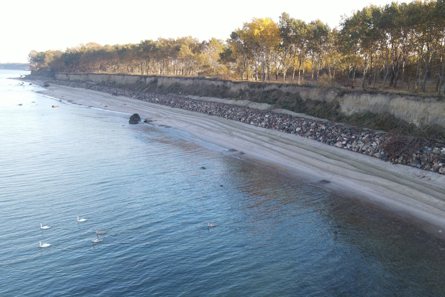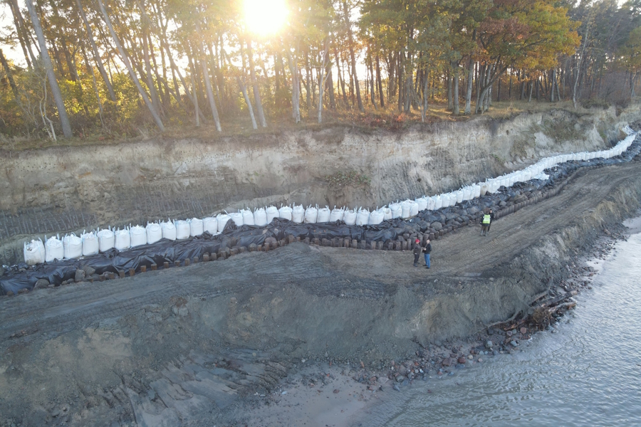 На центральном участке берега протяженностью 896 метров выполнено 170 метров берегоукрепления. На следующих ста метрах ведутся работы по устройству ядра из геобэгов, отметили в «Балтберегозащите».