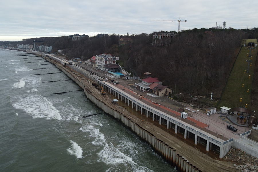 «На конец года техническая готовность набережной составляет более 70 % от общего объема работ, — сообщают представители организации. — Подрядчик завершает устройство плит перекрытий, бетонирование фасадных элементов. Идёт устройство деревянных покрытий, укладка брусчатки и клинкерной плитки. Со стороны солнечных часов и канатной дороги осуществляются работы по благоустройству территории».