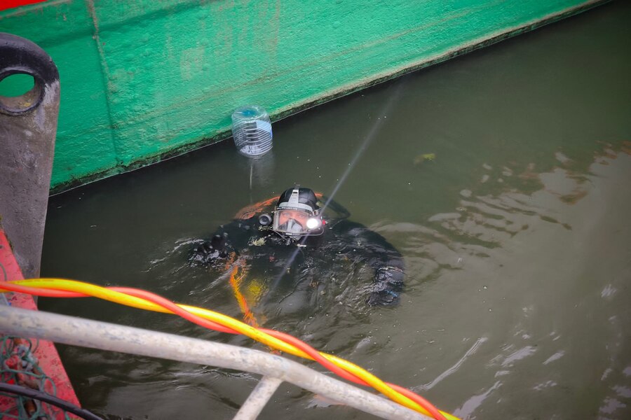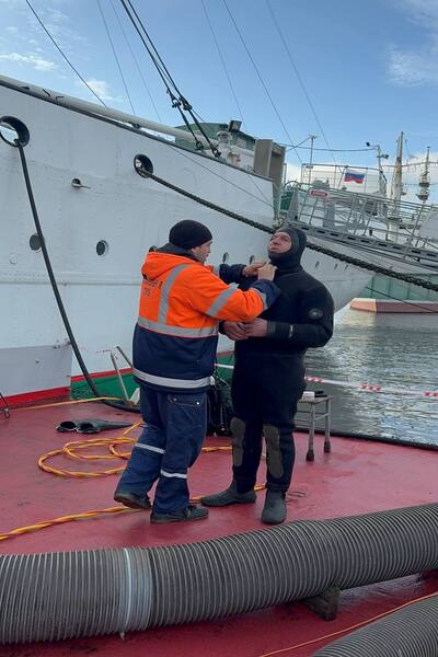 На время работ на «Витязе» подняли бело-синий флаг, который обозначает, что за бортом работают водолазы. Флаг также сигнализирует проходящим судам соблюдать осторожность и находиться на безопасном расстоянии.