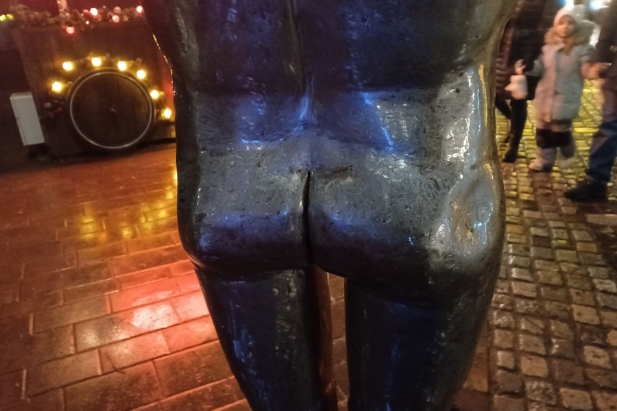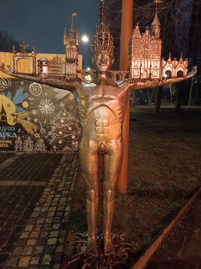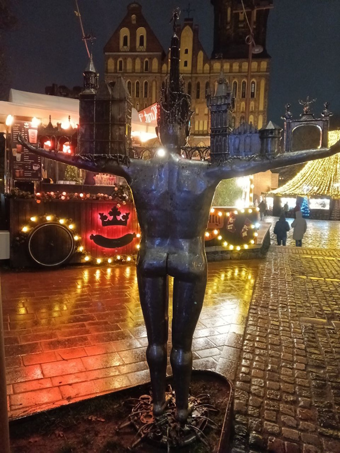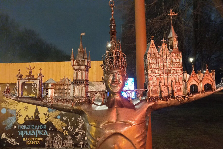 В Калининграде на острове Канта появилась скульптура голого человека с усами, на плечах и руках которого разместились миниатюры знаковых объектов Калининграда/Кёнигсберга. В их числе Королевский замок, Кафедральный собор, Бранденбургские ворота и ворота Лёбенихтского госпиталя.