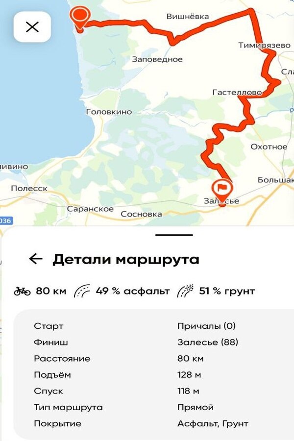 Покрытие маршрута состоит из грунта и асфальта — 51 и 49% соответственно. «Подъём — 128 м, спуск — 118 м», — указано в приложении.