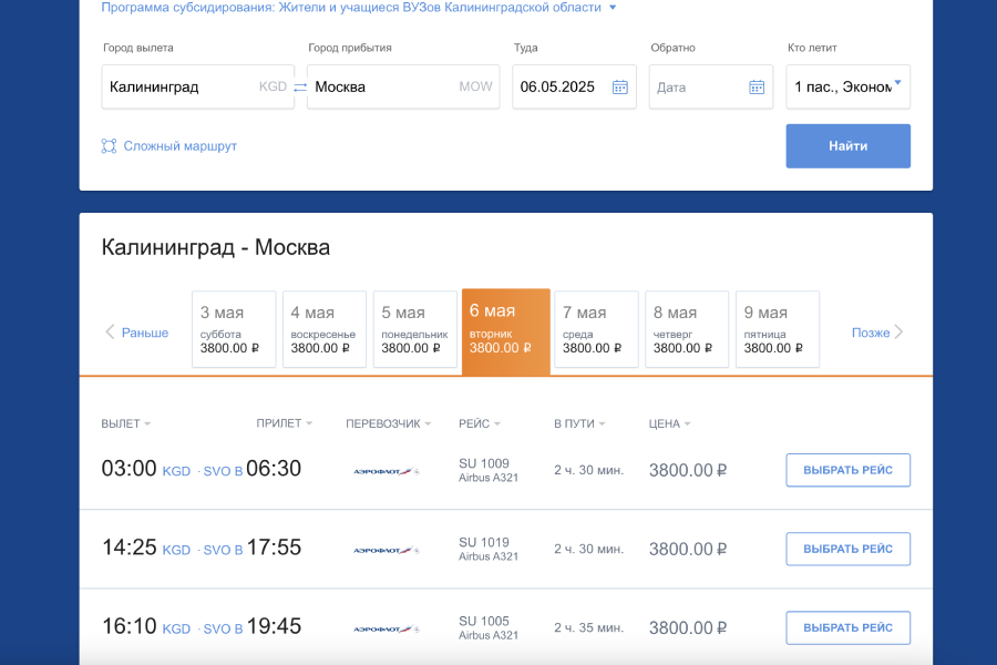 При этом в Москву из Калининграда улететь по льготной цене пока что возможно. Начиная с 28 апреля авиакомпания предлагает несколько рейсов по стоимости в 3,8 тыс. руб. Перелёты из столицы в Калининград также в наличии все майские праздники, при этом количество рейсов в день разнится в зависимости от даты.