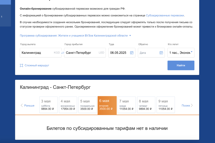 Начиная с 30 апреля и по 19 мая льготных авиабилетов в Петербург у перевозчика нет. На момент публикации новости в 12:35 остался единственный перелёт по субсидируемой цене: 5 мая в 21:50. То же самое касается обратного направления. С 28 апреля и по 12 мая субсидированных билетов из Санкт-Петербурга в Калининград в наличии нет.