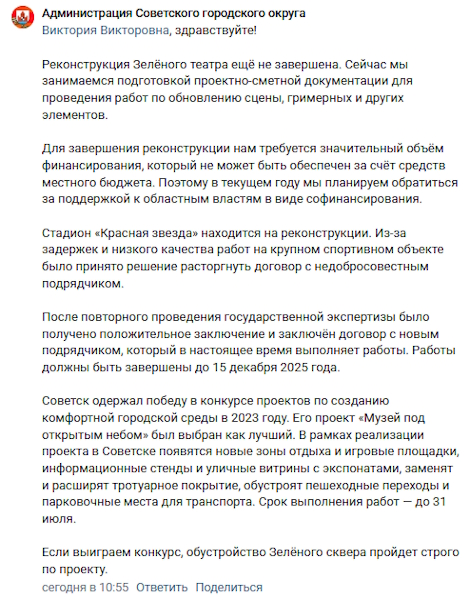 На состояние стадиона в числе прочих объектов в Советске пожаловалась посетительница страницы. «В Советске на сегодняшний день печаль: Зелёный театр развалили и не достроили, стадион „Красная звезда“ — та же история, „Музей под открытым небом“ не вызывает радости, а теперь ещё „Зелёный сквер“, который так и останется красивым на бумаге и в докладах», — написала она.
