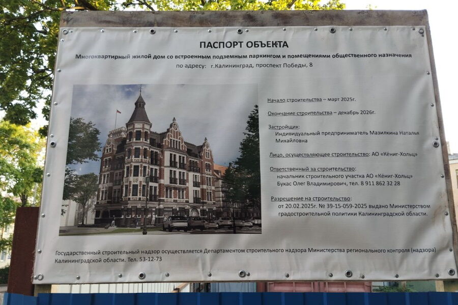 На стройке скандального дома на проспекте Победы (район перекрёстка с улицей Пушкина) смонтирован строительный кран и появился паспорт объекта, сообщающий, что закончить строительство дома № 8 «со встроенным подземным паркингом и помещениями общественного назначения» индивидуальный предприниматель Мазилкина Наталья Михайловна планирует в декабре 2026 года. Также паспорт объекта сообщает, что строительство осуществляется силами компании «Кёниг-Хольц». На размёщённом там же слайде с изображением будущего здания можно увидеть объект, фото которого ещё в октябре 2024 года были предоставлены источником «Нового Калининграда».