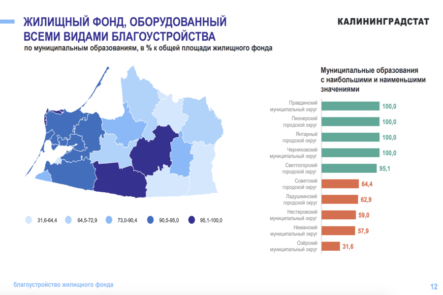 В список муниципалитетов с наименьшей долей благоустроенного жилья также вошли Неманский (57,9 %), Нестеровский (59 %), Ладушкинский (62,9 %) и Советский (64,4 %) округа. Полностью благоустроенными признаны четыре муниципалитета — Правдинский, Пионерский, Янтарный и Черняховский.