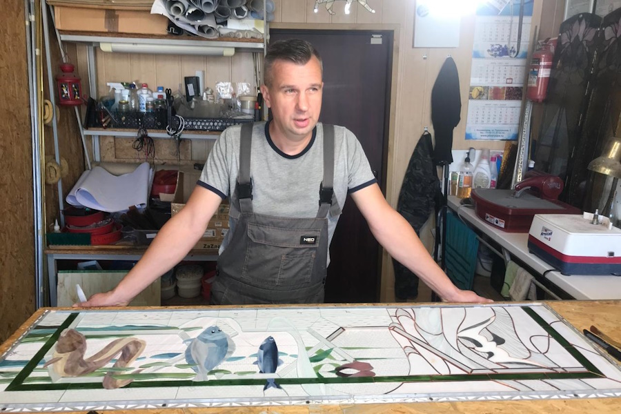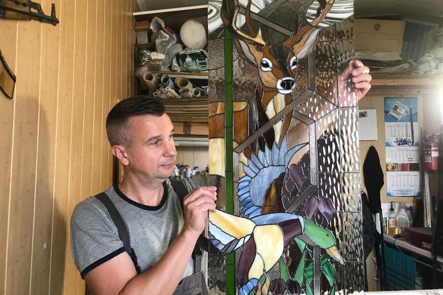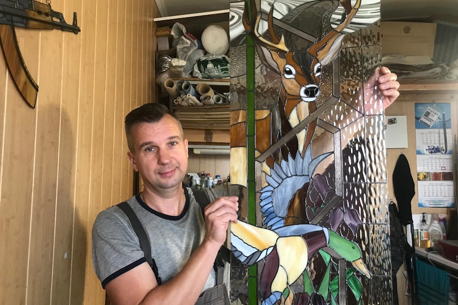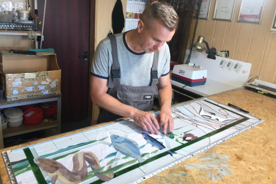 Мастер Александр Полежаев заканчивает работу над витражами, которые должны украсить дверь ресторана «Телеграф» (исторического здания почтамта) на Курортном проспекте Зеленоградска. Установка витражей, по словам мастера, планируется во второй половине августа.