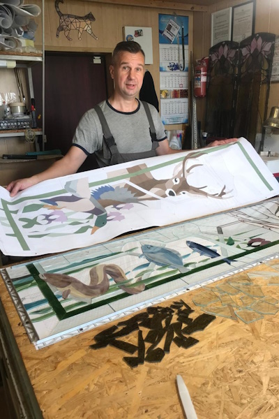 На одной панели изображены местные рыбы: угорь, камбала, форель, на другой — животные: олень и утка. «Эскиз нарисовала архитектор Наталья Пьянкова, — рассказывает Александр Полежаев. — В витраже использовал больше двадцати цветов. Они неброские, но когда на стекла будет падать свет, всё, поверьте, заиграет!»