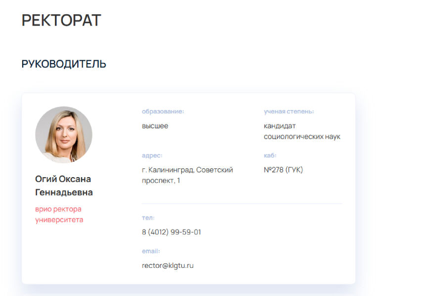 Первый проректор Калининградского государственного технического университета Оксана Огий стала временно исполняющим обязанности руководителя вуза. Информация об этом размещена на сайте учебного заведения.