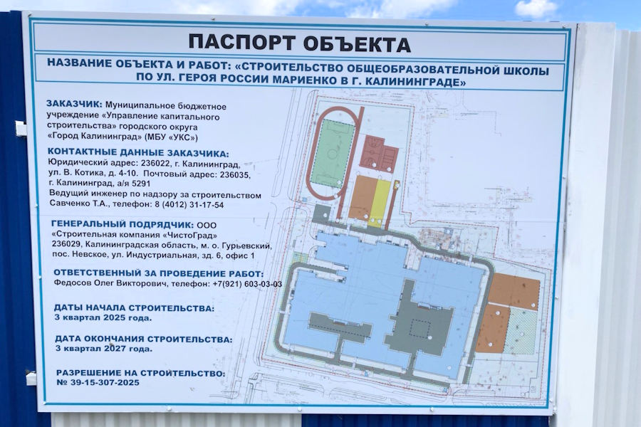 Контракт на строительство школы на ул. Героя России Мариенко в Калининграде стоимостью порядка 4,3 млрд рублей власти заключили 28 июля 2025 года с ООО СК «Чистоград». На земельном участке с кадастровым номером 39:15:131913:1938 уже начались работы. На строительство отводится 798 дней, на ввод объекта в эксплуатацию — 30. Контракт необходимо исполнить до 11 ноября 2027 года.