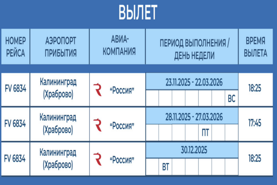 Самолёты будут летать по пятницам и воскресеньям до 27 марта. Дополнительный рейс также назначен на вторник, 30 декабря. Стоимость билетов начинается от 8 тыс. руб. Время в пути: 2 часа 50 минут.