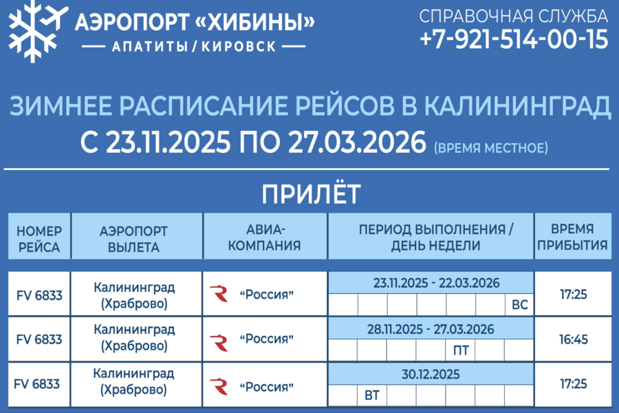 Авиарейсы по направлению «Калининград — Апатиты» возобновятся 23 ноября. Рейсы будет выполнять авиакомпания «Россия». Информация об этом размещена на сайте аэропорта «Хибины».
