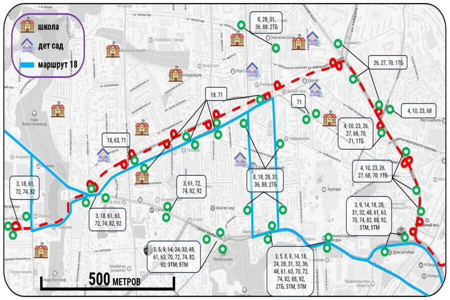 На время отсутствия трамвая № 5 «ул. Бассейная — ул. Дюнная» на Советском проспекте и Фестивальной аллее для удобства пассажиров и сохранения транспортной доступности изменится схема автобуса маршрута № 18 «ул. Большая Окружная 1-я — мкр. Прибрежный». С 22 сентября по 31 декабря он будет следовать по ул. Карла Маркса до ул. Комсомольской (в центр) или ул. Леонова (из центра). Об этом сообщил Центр организации движения и пассажирских перевозок.