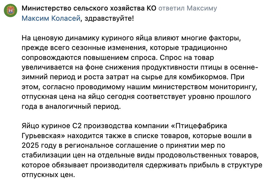 Они также напомнили о том, что куриное яйцо категории С2 производства компании «Птицефабрика Гурьевская» находится в списке товаров, которые вошли в 2025 году в региональное соглашение о принятии мер по стабилизации цен на отдельные виды продовольственных товаров, которое обязывает производителя сдерживать прибыль в структуре отпускных цен.
