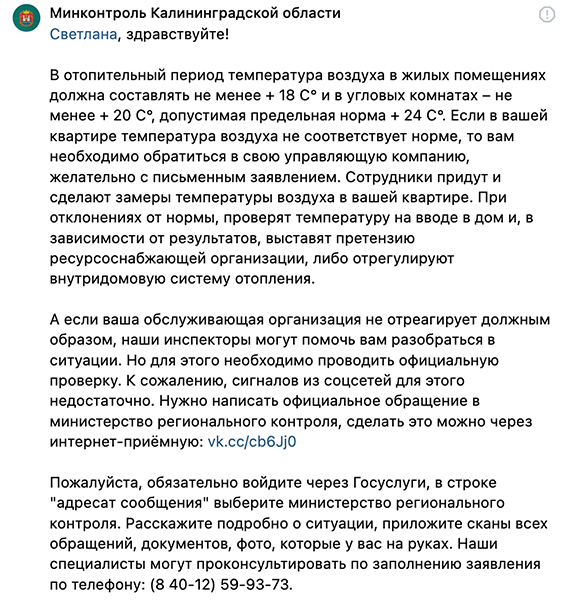 Ответ последовал от представителей регионального минконтроля. Перечислив нормативные показатели температуры в жилых помещениях в отопительный период, женщине посоветовали обратиться в управляющую компанию лично с письменным заявлением. «Сотрудники придут и сделают замеры температуры воздуха в вашей квартире. При отклонениях от нормы проверят температуру на вводе в дом и в зависимости от результатов выставят претензию ресурсоснабжающей организации либо отрегулируют внутридомовую систему отопления. А если ваша обслуживающая организация не отреагирует должным образом, наши инспекторы могут помочь вам разобраться в ситуации. Но для этого необходимо проводить официальную проверку», — рассказали в министерстве.