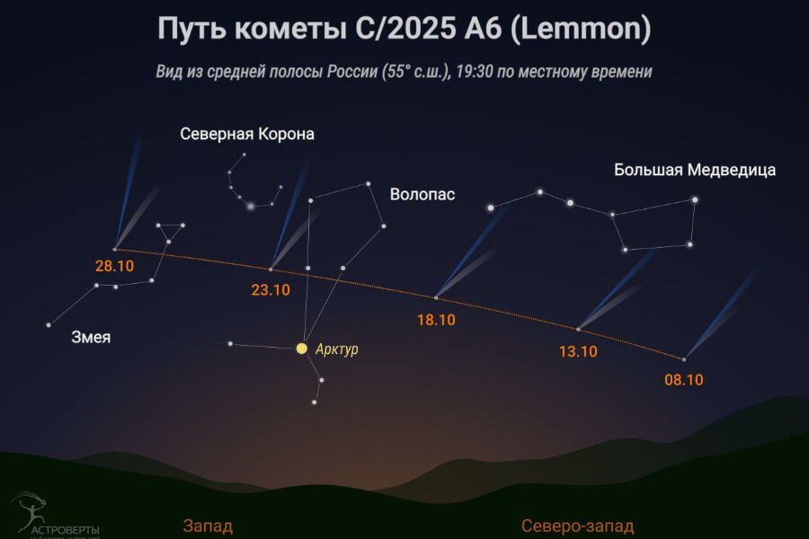 Также он отметил, что пик яркости ожидается в конце октября, но уже сейчас комету можно заметить под ковшом Большой Медведицы — недалеко от яркой звезды Арктур.