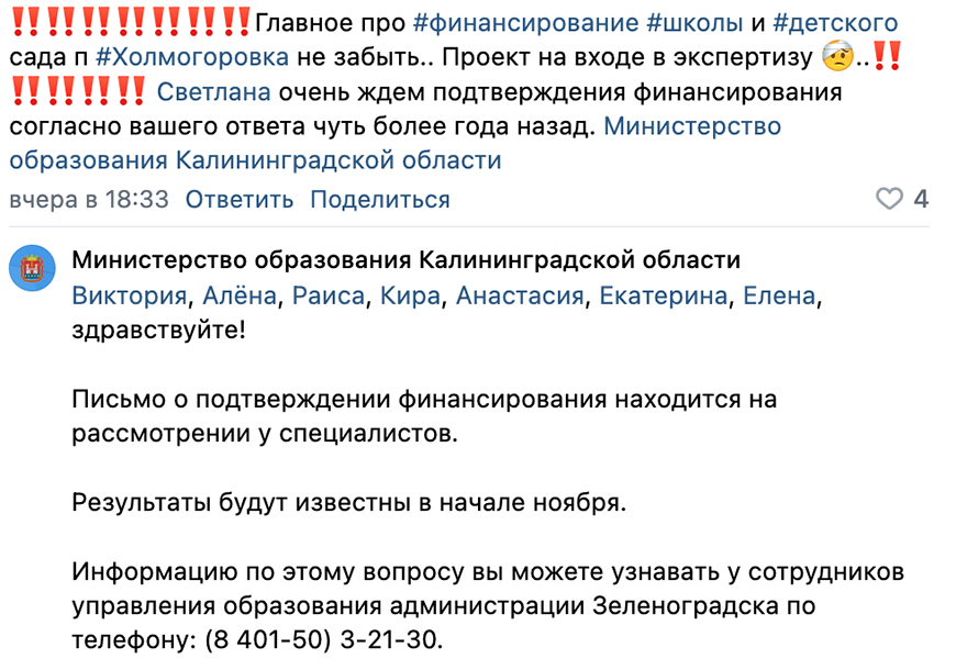По поводу обещанного ранее строительства школы и детского сада поступило сразу несколько обращений. «Холмогоровка ждёт школу! Новые ЖК и частные дома строят как не в себя — а для детей что? Близлежащие школы уже лопаются от количества детей! Куда нам деваться? В город ещё не каждого возьмут, плюс добираться возможность есть не у всех людей, тем более что вопрос общественного транспорта стоит так же остро, как и образование в Холмогоровке», — написала одна из посетительниц страницы. «Холмогоровский сад трещит по швам, до школы дети ездят на автобусе, посёлку нужны свои учреждения», — говорится в другом обращении. Ещё одна из местных жительниц напомнила, что подождать подтверждения финансирования родителей Холмогоровки просили ещё год назад.
