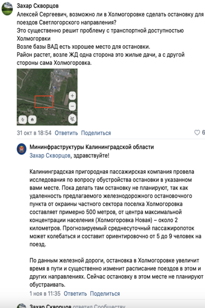 С предложением обустроить остановку вблизи «ВАДа» обратился местный житель. По его мнению, остановка для поездов светлогорского направления «существенно решит проблему с транспортной доступностью Холмогоровки».