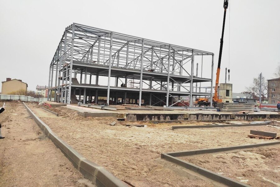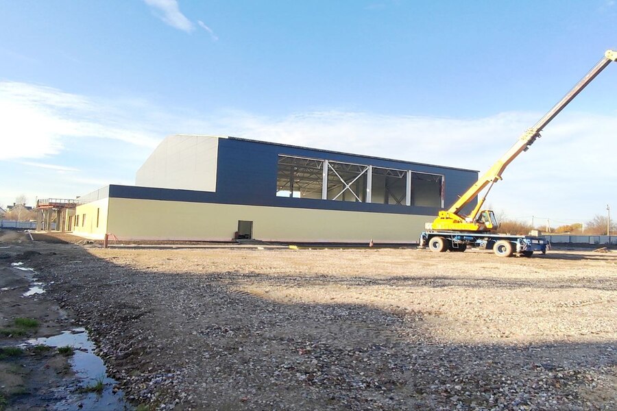 В основном здании ведется монтаж металлического каркаса и установка внутренних перегородок. Межэтажные перекрытия из железобетонных плит уложены частично. В здании с теннисными кортами установили металлический каркас и смонтировали стеновые и кровельные сэндвич-панели. Сейчас там завершают внутреннюю отделку.