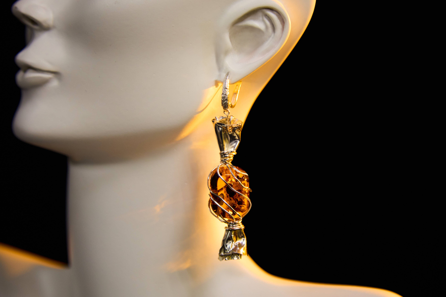 Янтарные конфеты изготовлены из прозрачного самоцвета. Сходства с леденцами ювелиры комбината достигли благодаря лузгованию — специальной обработке камня в автоклаве. Под воздействием давления и температуры внутри самоцвета образовались микровзрывы пузырьков воздуха, визуально напоминающие искорки. Они придали изделию мягкое свечение и карамельный блеск. Это усилило выразительность янтаря, при этом форма и оттенок самоцвета остались неизменными. «Обертку» для леденцов мастера выполнили из серебра, аккуратно повторив форму фантика. В каждой сережке и подвеске использовано по три грамма янтаря и около шести граммов драгоценного металла.