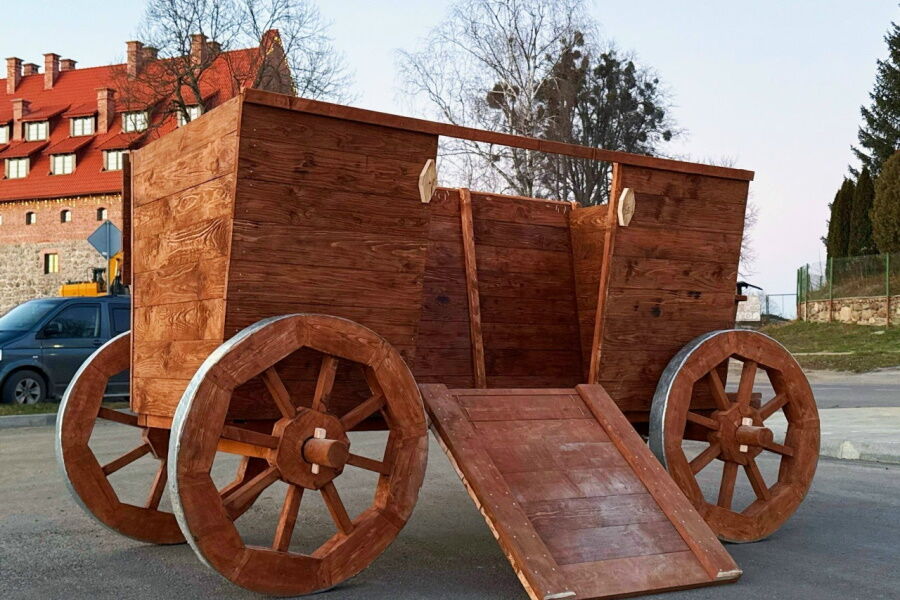 Для замка Прейсиш-Эйлау в Багратионовске изготовили реплику боевой повозки средневековых рыцарей. О том, что деревянная конструкция была доставлена в замок накануне Нового года, сообщили представители замка в своём официальном паблике «ВКонтакте».