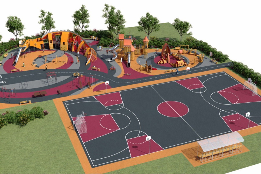 На площадке необходимо оборудовать спортивно-игровые комплексы «Дракон», «Замок», «Карета» и «Дворик», а также качели, карусели и прочие игровые и развивающие элементы.