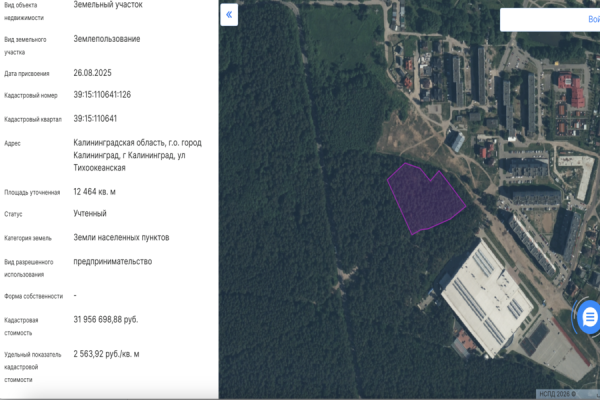 Строительство запланировано на участке с кадастровым номером 39:15:110641:126, предназначенном под предпринимательство. Его уточнённая площадь составляет 12 464 кв. м, а стоимость по кадастру — 31,9 млн руб. Разрешение будет действительно до 29 января 2028 года.