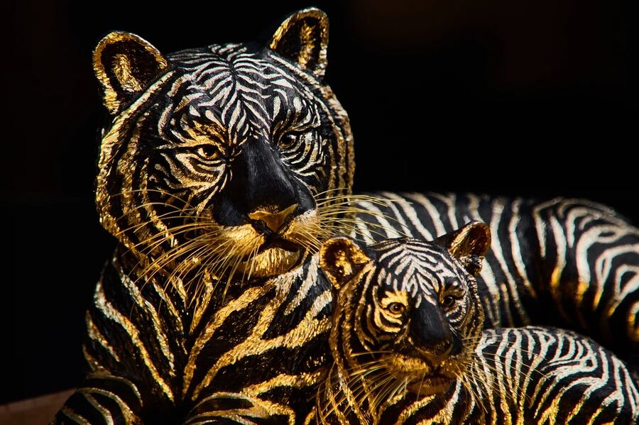 В пресс-службе добавили, что поталь также применяют при создании сувениров. В частности, декоративный сплав использован в скульптуре «Тигрица с тигренком» из темного прессованного янтаря, где с его помощью выполнены светло-золотистые полоски.