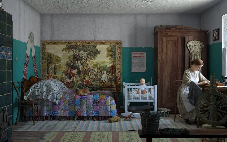«В основу виртуальной реконструкции положен собирательный образ типичной семьи из четырёх человек — родители, младенец и дочь школьного возраста, глава семьи — председатель колхоза, сформированный на основе анализа статистических данных о миграции 1946–1947 годов», — говорится в сообщении.