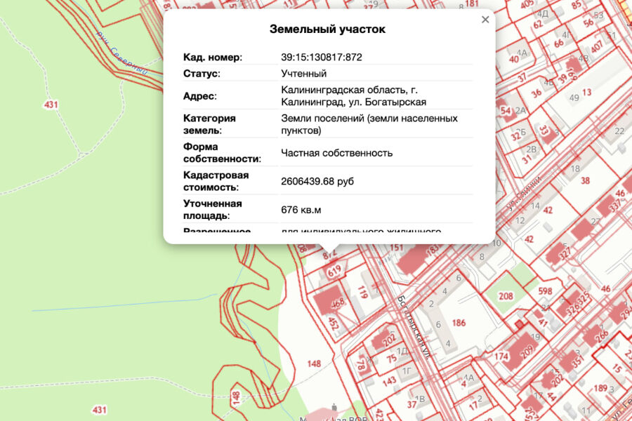 Согласно данным публичной кадастровой карты, площадь указанного участка — 676 кв.м. Разрешено для индивидуального жилищного строительства.