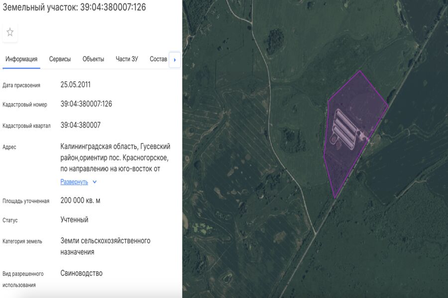 Строительство запланировано на участке с кадастровым номером 39:04:380007:126, предназначенном под свиноводство. Его уточненная площадь составляет 200 тыс. кв. м, а стоимость по кадастру — 1 млн руб.