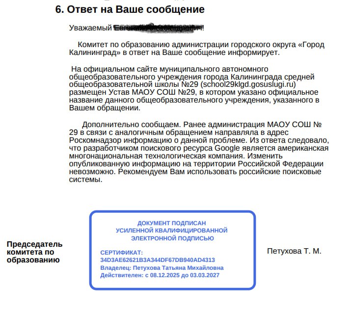 «Из ответа следовало, что разработчиком поискового ресурса Google является американская многонациональная технологическая компания. Изменить опубликованную информацию на территории Российской Федерации невозможно. Рекомендуем использовать российские поисковые системы», — подчеркнули в администрации.