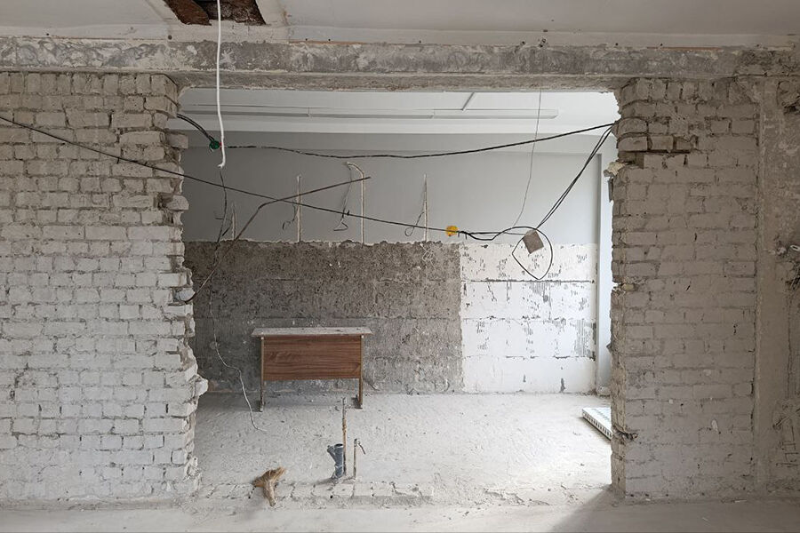 Работы начали в конце января с демонтажа. Его завершили 3 марта, убрав внутренние перегородки и ненесущие конструкции, старые покрытия с пола и штукатурку со стен. Также были демонтированы все старые инженерные системы: отопление, вентиляция, водоснабжение, канализация, электрика и слаботочные системы.