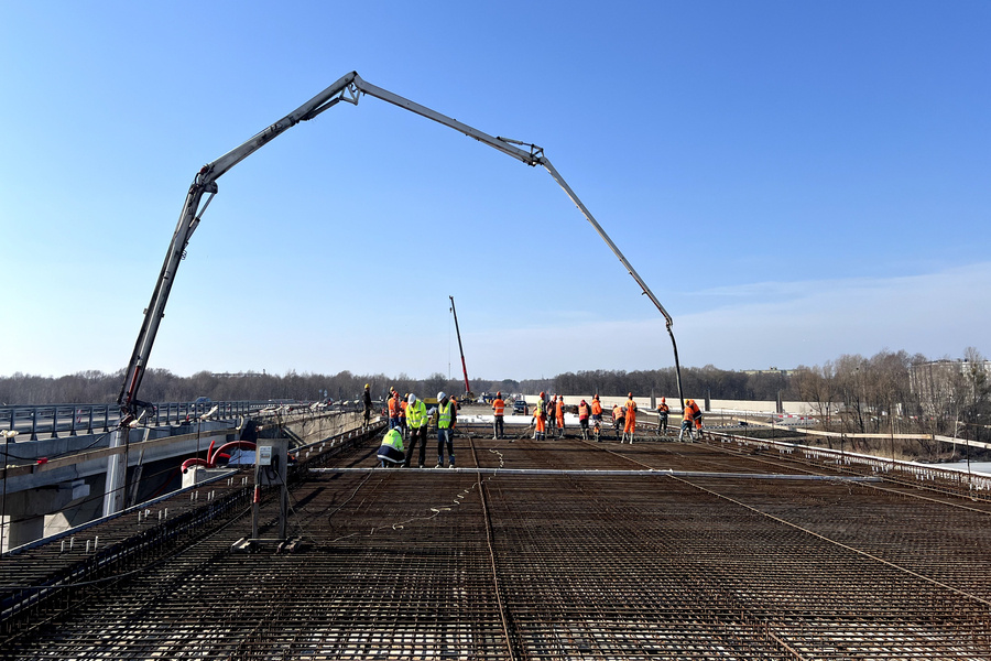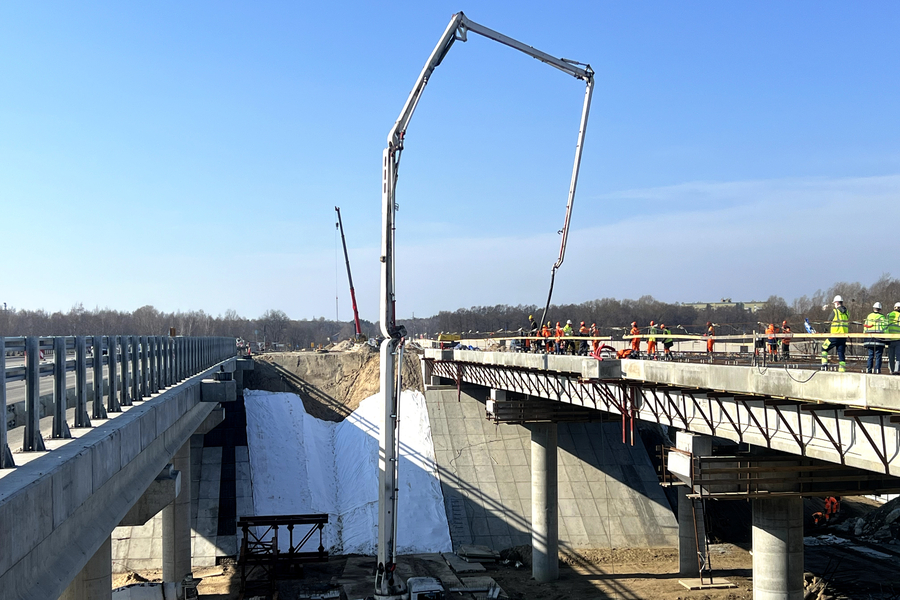 Специалисты приступили к бетонированию сразу при наступлении устойчивых плюсовых температур. Путепроводы на пересечении с проспектом Победы и с железнодорожными путями Калининград — Балтийск бетонируют на основном ходу. На мосту через Питьевое озеро завершено армирование монолитной плиты пролетного строения и начато ее поэтапное бетонирование.