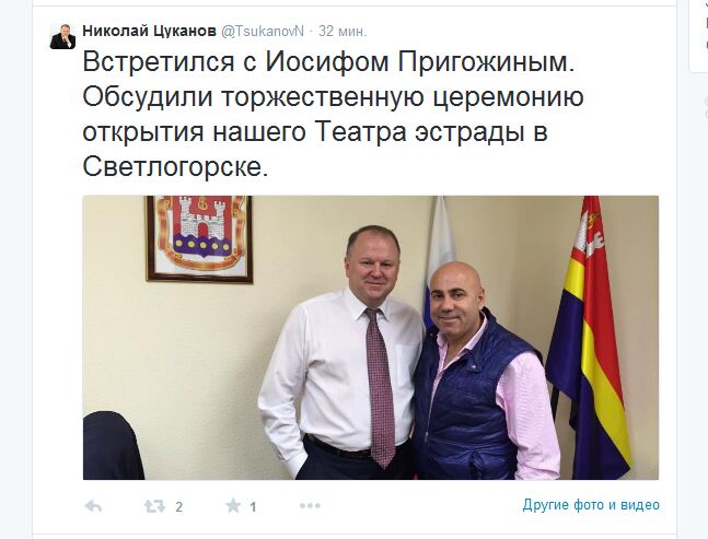 Губернатор Калининградской области Николай Цуканов обсудил торжественную церемонию открытия строящегося Театра эстрады в Светлогорске с продюсером Иосифом Пригожиным. Об этом глава региона написал в своем микроблоге в «Твиттере» в четверг.