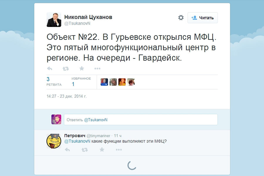 Во вторник в Гурьевске открылся многофункциональный центр. Об этом в своем микроблоге в «Твиттере» написал губернатор региона Николай Цуканов.