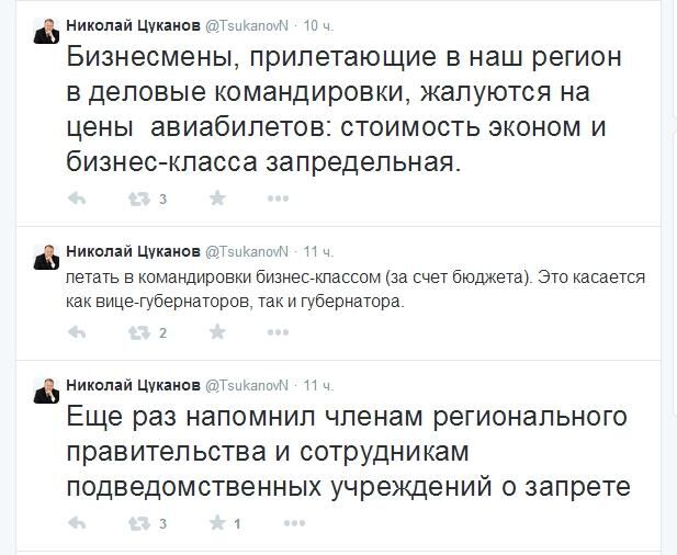 Глава региона Николай Цуканов напомнил своим подчиненным о запрете на перелеты в командировки бизнес-классом за счет бюджета для сотрудников правительства и подведомственных учреждений. Об этом губернатор написал в своем микроблоге в «Твиттере».