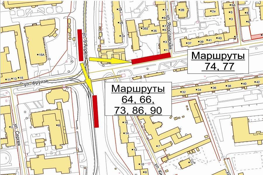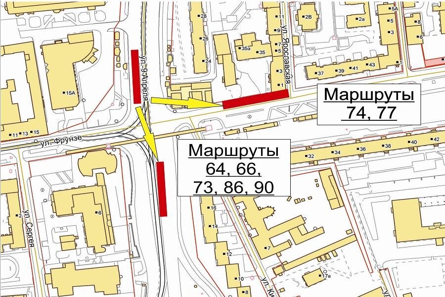 «Остановка автобусов малого класса категории М2 маршрутов № № 64, 66, 73, 86 и 90 будет осуществляться на трамвайной остановке расположенной на ул. 9 Апреля, напротив „Дома быта“. Разворот будет осуществляться по новому путепроводу с заездом на просп. Московский. Остановка автобусов малого класса категории М2 маршрутов № № 74, 77 будет осуществляться на ул. Фрунзе, перед перекрестком с ул. 9 Апреля», — отметили в мэрии.