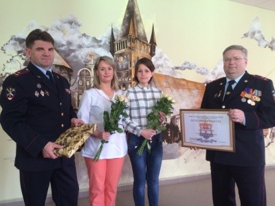 На фото: начальник медсанчасти Петр Шостак, Анастасия Гутшмидт с мамой и начальник управления по работе с личным составом УМВД Роман Кукушкин. Фото