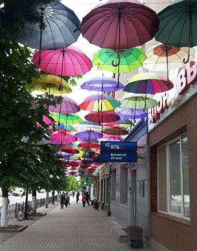 В центре Гусева над широким тротуаром на ул. Победы появился своеобразный навес из зонтиков. Как сообщили корреспонденту «Нового Калининграда.Ru» в местной администрации, таким образом городские власти подготовили улицу к Дню города.