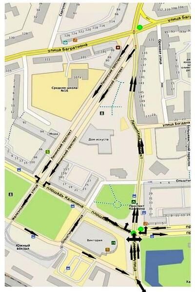 Для увеличения пропускной способности перекрестка ул. Киевская — Ленинский пр. — пр. Калинина — пл. Калинина вводится одностороннее движение на: