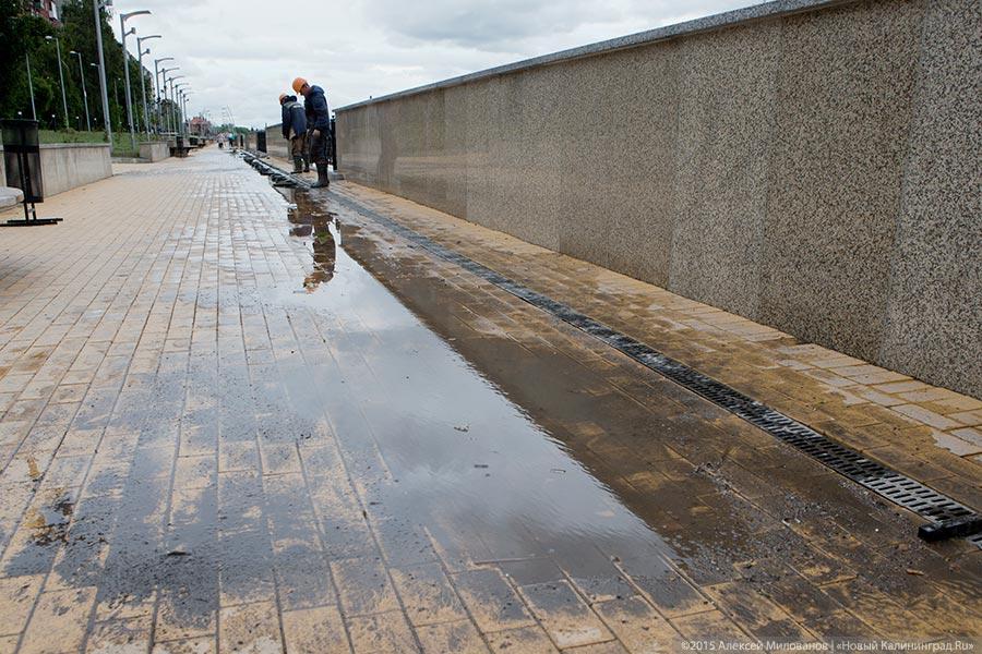 Ливневая канализация на реконструированной за более чем 650 млн рублей набережной адмирала Трибуца в Калининграде вновь не справляется с осадками. Как сообщает корреспондент «Нового Калининграда.Ru», в пятницу после дождя чиновникам мэрии города опять пришлось проводить выездное совещание, а сотрудники компании «Чистоград» были вынуждены вручную прочищать забитую канализацию. Несмотря на это, лужи стояли даже там, где канализация была прочищена, а также там, где её просто нет.