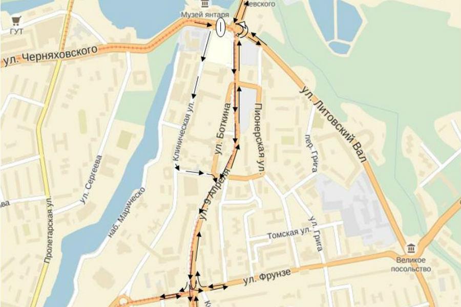 Транспорт, едущий с ул. Черняховского в сторону Литовского вала, пустят по ул. Черняховского — ул. Клинической — ул. Нерчинской — ул. 9 Апреля — мосту через реки Старая и Новая Преголя на Московский проспект. В обратном направлении транспорт пойдет по Московский проспекту через мост и на ул. Шевченко, затем на ул. Пролетарскую и ул. Черняховского.