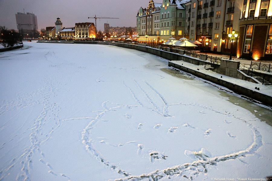 В Калининграде на льду реки Преголя, у Юбилейного моста, рядом с туристско-этнографическим комплексом «Рыбная деревня» местные жители вытоптали изображение полового члена. Как передаёт корреспондент «Нового Калининграда.Ru» в воскресенье, фаллос имеет около 30 метров в длину и ориентирован по направлению к Дому Советов, Кафедральному собору и вообще административному центру города.